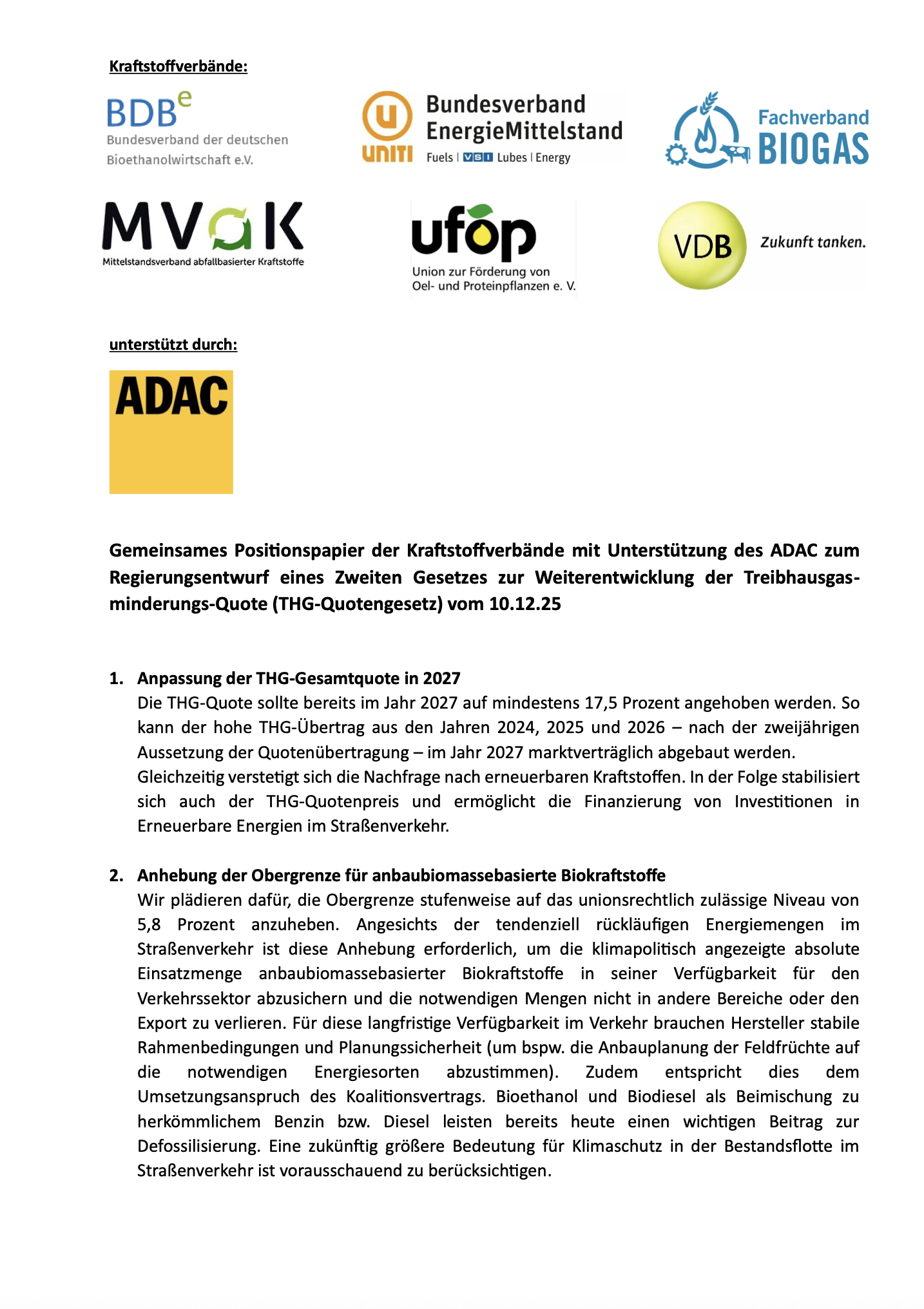 Zusammen mit dem ADAC und 15 weiteren Verbänden fordert der Verband der Deutschen Biokraftstoffindustrie eine deutliche Anhebung der THG-Quote. So können bestehende Quotenüberhänge abgebaut und die Nachfrage nach Erneuerbaren Energien im Verkehrssektor gesteigert werden.